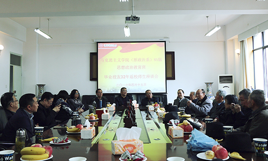 在师生座谈会上,马克思主义学院负责人对各位校友表示热烈欢迎,向大家介绍了近年来学院办学情况和取得的成绩,说明了学院近期开展的“马克思主义中国化大学生铸魂工程”、甘肃省重点马克思主义学院建设、学院马克思主义理论一级博士学位授权学科申报工作进展情况,希望各位校友常来指导交流,表示学院将始终坚持把立德树人作为教育教学中心环节,围绕“一流大学和一流学科建设”,勇于创新求真务实,推动学院不断发展。