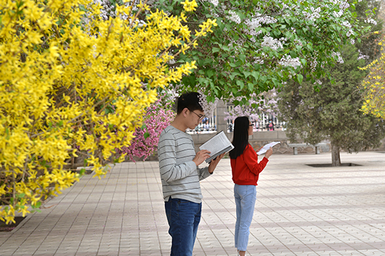 百年师大的春天,校园花飘,杨柳轻拂,丁香花淡雅旷远、馥郁芬芳。主干道上的连翘、探春、结香,教学楼旁海棠、玉兰、桃花…… 争相开放,尽态极妍。