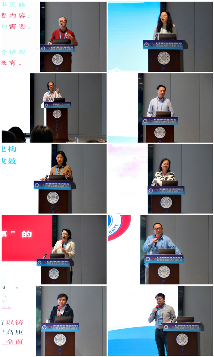 在专家代表交流环节,兰州大学李静教授阐释了本次学术研讨会对于助力民族地区学校铸牢中华民族共同体意识教育高质量发展的意义。在主题报告环节,中国人民大学陈立鹏教授、兰州大学李静教授、西南大学张学敏教授、青海师范大学李晓华教授、西南大学吴晓蓉教授、《中国民族教育》杂志社赵小雅研究员、中央民族大学袁梅教授、西南大学蒋立松教授、中央民族大学海路教授、青海民族大学陈振宁教授分别以“铸牢中华民族共同体意识教育需重点研究的十大问题”“学校铸牢中华民族共同体意识的教育逻辑”“育时代新人——铸牢中华民族共同体意识的教育学探析”“基于教科书开展中华民族共同体意识教育的探索——以初中《道德与法治》教科书为例”“无形有感:学科叙事赋能中华民族共同体意识建构”“学校铸牢中华民族共同体教育的时代背景及现实路径”“民族院校教师‘讲好中华民族共同体故事’的叙事逻辑及思政引领力研究”“以实验方法夯实铸牢中华民族共同体意识教育的理论基础”“项目式学习赋能学校铸牢中华民族共同体意识教育:内涵、价值与实施”“铸牢中华民族共同体意识的文化学阐释:理论意涵、机制导向与实践理路”为题作报告,分享了学校铸牢中华民族共同体意识教育的最新理论研究成果和实践策略。